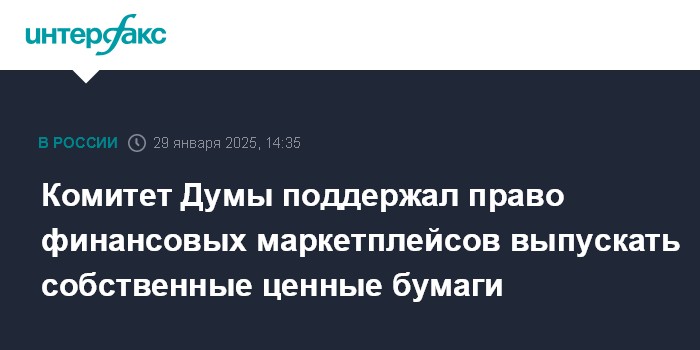 Москва. 29 января. INTERFAX.RU - Комитет Госдумы по финансовому рынку одобрил к принятию в первом чтении законопроект, который разрешает операторам финансовых платформ в России быть стороной сделок с собственными ценными бумагами на этих же платформах.