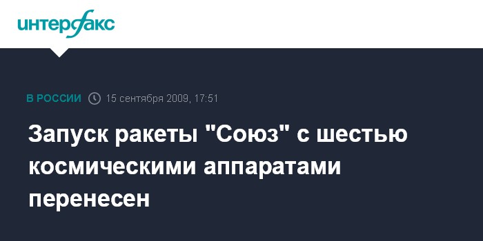 Москва. 15 сентября. INTERFAX.RU - Запланированный на вечер вторника запуск ракеты-носителя "Союз-2.1б" с метеоспутником "Метеор-М" и еще пятью космическими аппаратами отложен, сообщили "Интерфаксу-АВН" в Роскосмосе.