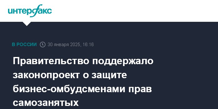 Москва. 30 января. INTERFAX.RU - Правительство направило в Госдуму положительное заключение на законопроект, который предлагает наделить уполномоченного при президенте по защите прав предпринимателей, а также уполномоченных бизнес-омбудсменов в регионах правом рассматривать жалобы самозанятых граждан.