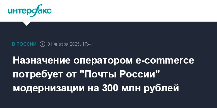 Москва. 31 января. INTERFAX.RU - Назначение АО "Почта России" единым оператором электронной торговли (ОЭТ) потребует от него модернизации инфраструктуры, в том числе ИТ-систем; компания оценивает затраты на это примерно в 300 млн рублей.