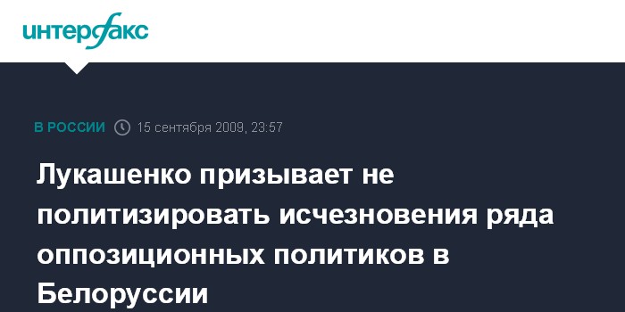 Минск. 15 сентября. ИНТЕРФАКС-ЗАПАД - Президент Белоруссии Александр Лукашенко призывает не политизировать тему расследования обстоятельств исчезновения ряда белорусских оппозиционных политиков.
