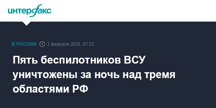 Москва. 2 февраля. INTERFAX.RU - Средствами противовоздушной обороны в ночь на воскресенье перехвачены и уничтожены пять украинских дронов над Курской, Белгородской и Брянской областями, сообщили в Минобороны РФ.