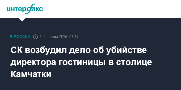 Москва. 3 февраля. INTERFAX.RU - Следователи возбудили дело об убийстве 45-летнего генерального директора гостиничного комплекса по ул. Карла Маркса в Петропавловске-Камчатском (ч. 1 ст. 105 УК РФ), сообщает Следственное управление СКР по Камчатскому краю в понедельник.