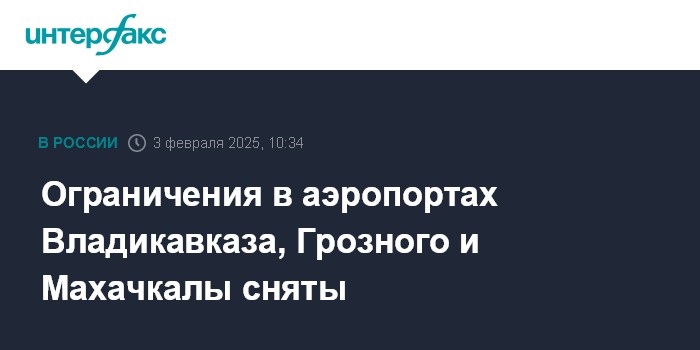 Москва. 3 февраля. INTERFAX.RU - Временные ограничения на прием и выпуск самолетов отменены в аэропортах Грозного, Махачкалы и Владикавказа, сообщает Росавиация.