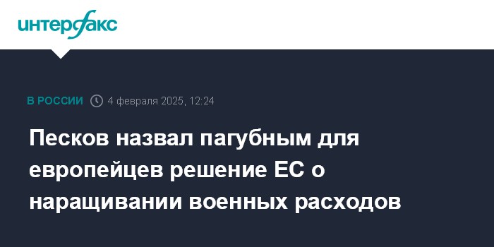 Москва. 4 февраля. INTERFAX.RU - Решение Евросоюза об увеличении военных расходов под предлогом угрозы от России недальновидно и пагубно для каждого европейца, заявил пресс-секретарь президента России Дмитрий Песков.