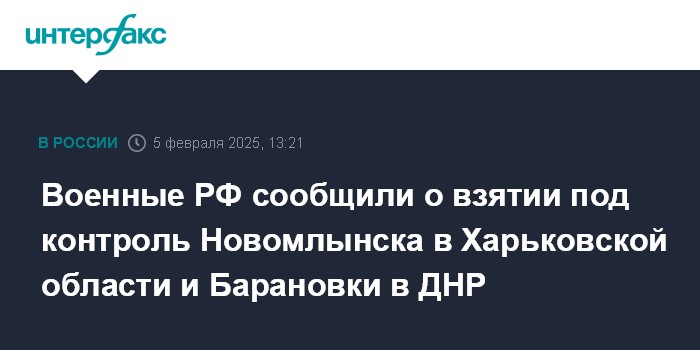 Москва. 5 февраля. INTERFAX.RU - Вооружённые силы России взяли под контроль два населённых пункта - Новомлынск в Харьковской области и Барановку в ДНР, сообщает министерство обороны РФ.