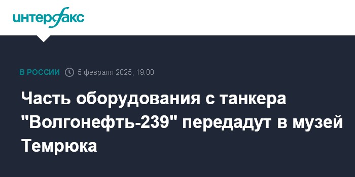 Москва. 5 февраля. INTERFAX.RU - Экспозиция Темрюкского историко-археологического музея пополнится оборудованием с кормы танкера "Волгонефть-239", севшего на мель в районе поселка Тамань Темрюкского района Краснодарского края, сообщает оперштаб региона.