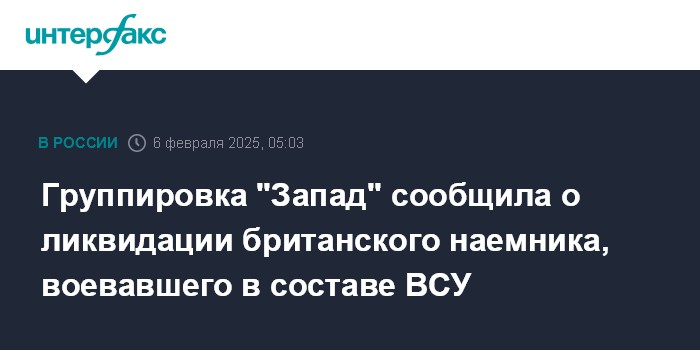 Москва. 6 февраля. INTERFAX.RU - Наемник из Великобритании, воевавший в составе вооруженных сил Украины с июля 2023 года, ликвидирован военнослужащими группировки "Запад", сообщил представитель группировки Иван Бигма в четверг.