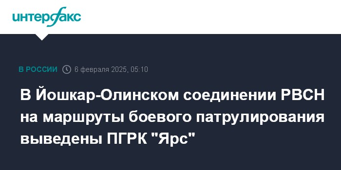 Москва. 6 февраля. INTERFAX.RU - Пусковые установки подвижного грунтового ракетного комплекса (ПГРК) "Ярс" в Йошкар-Олинском ракетном соединении вышли на маршруты боевого патрулирования, сообщили в Минобороны России.