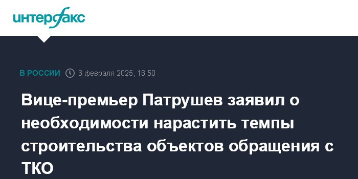 Москва. 6 февраля. INTERFAX.RU - Масштабы и темпы строительства объектов обращения с твердыми коммунальными отходами (ТКО) необходимо наращивать для выполнения целей нового федерального проекта "Экономика замкнутого цикла", заявил вице-премьер Дмитрий Патрушев.
