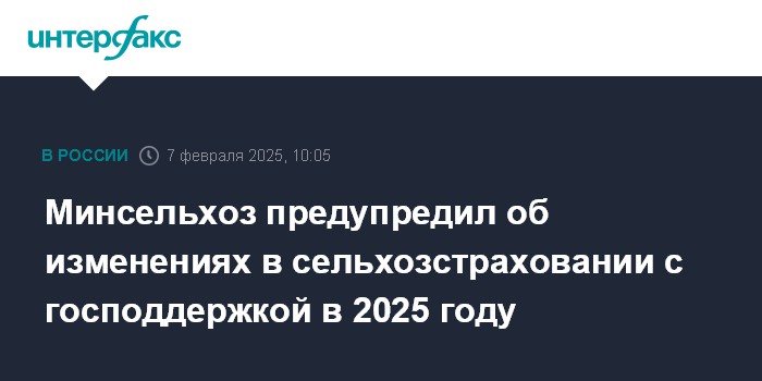 Москва. 7 февраля. INTERFAX.RU - В 2025 году для российских аграриев в сельхозстраховании с господдержкой предусмотрен ряд изменений, которые должны повысить привлекательность субсидируемых договоров защиты, сообщает Минсельхоз.