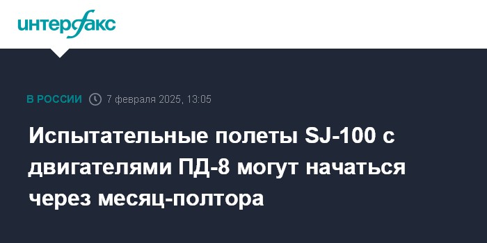 Москва. 7 февраля. INTERFAX.RU - Минпромторг ожидает начало испытательных полетов ближнемагистрального самолета SJ-100 с российским двигателем ПД-8 в феврале-марте 2025 года, сертификационные полеты среднемагистрального МС-21, двигатель для которого ПД-14 уже сертифицирован, должны также начаться в ближайшие месяцы, сообщил журналистам глава ведомства Антон Алиханов.