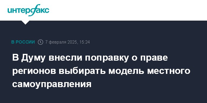 Регионы РФ могут получить право самостоятельно определять модель местного самоуправленияЧитать подробнееПоправки внесены в законопроект № 40361-8 "Об общих принципах организации местного самоуправления в единой системе публичной власти". Они подготовлены с учетом мнения регионов, добавили в пресс-службе.