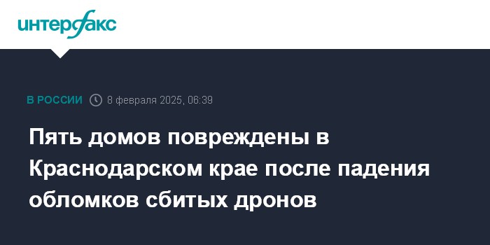Пять домов повреждены в Краснодарском крае после падения обломков сбитых дронов