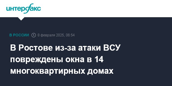 Москва. 8 февраля. INTERFAX.RU - После атаки украинских беспилотников на Ростов повреждены окна и оконные рамы в 14 многоквартирных домах, сообщил врио губернатора Юрий Слюсарь в субботу.