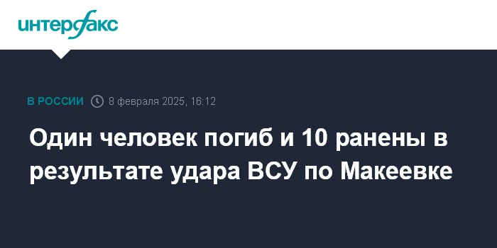 Москва. 8 февраля. INTERFAX.RU - Один человек погиб в результате удара ВСУ по Макеевке в Донецкой народной республике, сообщил в субботу глава региона Денис Пушилин.