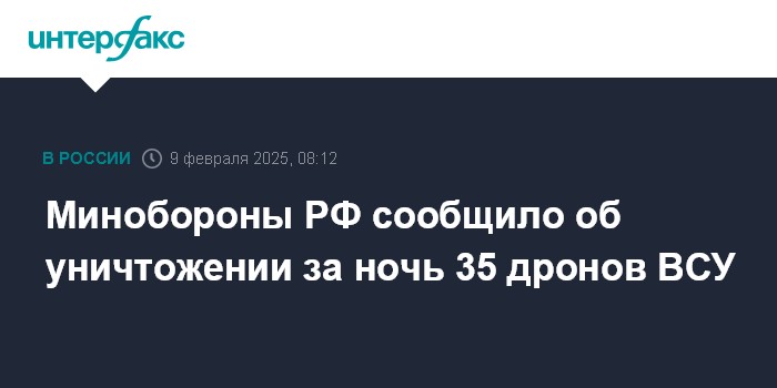 Москва. 9 февраля. INTERFAX.RU - В ночь на воскресенье над восемью российскими регионами уничтожено 35 украинских беспилотников, сообщило Минобороны РФ.