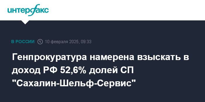 Москва. 10 февраля. INTERFAX.RU - Генпрокуратура намерена через Арбитражный суд Сахалинской области взыскать в доход государства 52,58% долей СП ООО "Сахалин-Шельф-Сервис", работающего на углеводородных шельфовых проектах Сахалина и Камчатки и связанного с Сергеем Богданчиковым и Марком Гарбером.