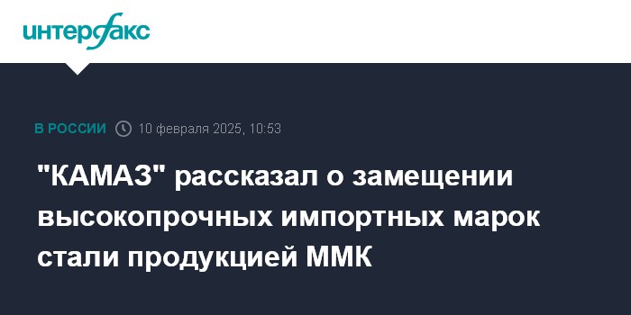Москва. 10 февраля. INTERFAX.RU - Значительная часть импортного металла на камазовском автозаводе, особенно высокопрочные стали, замещена российской продукцией ПАО "Магнитогорский металлургический комбинат" (ММК), сообщила пресс-служба ПАО "КАМАЗ".