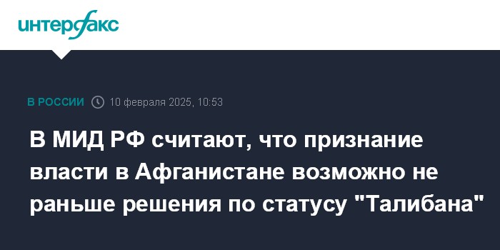 Москва. 10 февраля. INTERFAX.RU - В МИД РФ призывают не забегать вперед в вопросе официального признания действующих властей Афганистана, дождаться решения вопроса вывода движения "Талибан" (террористическая организация, запрещена в РФ) из национального списка запрещенных организаций.