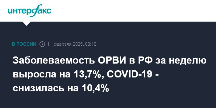 Москва. 11 февраля. INTERFAX.RU - Количество заболевших ОРВИ в РФ за неделю выросло более чем на 13,7% по сравнению с предыдущей неделей, показатель заболеваемости COVID-19 за аналогичный период снизился на 10,4%, сообщили в Роспотребнадзоре.