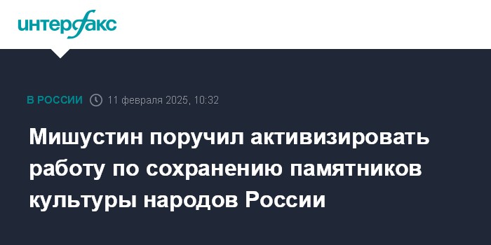 Москва. 11 февраля. INTERFAX.RU - Премьер-министр Михаил Мишустин поручил активизировать работу по подготовке программы сохранения объектов культурного наследия народов России, а также провести инвентаризацию таких объектов и подготовить специалистов в области сохранения объектов культурного наследия. Об этом сообщает сайт правительства.