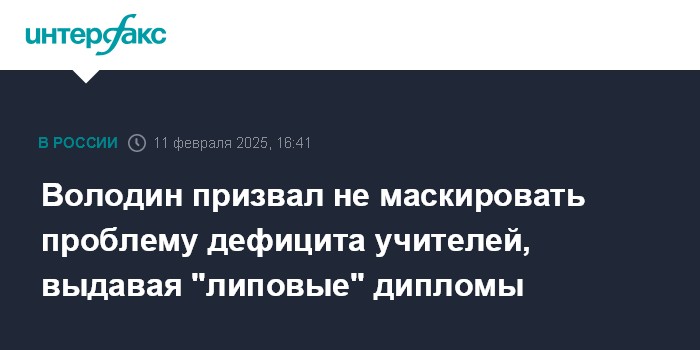 "Если есть дефицит кадров, надо о нем говорить. А так получается, на бумаге и в отчетах одно, а на деле другое. И когда президент уже говорит, ну посмотрите, 33% не хватает у нас в школах математиков, более 37% учителей физики. И все равно упираются, будут говорить, что у них там все замечательно, полтора процента дефицит кадров. Ну, вот этого не должно быть", - сказал Володин, выступая на "правительственном часе" в Госдуме. "Зачем мы врем-то, а? И кому врем? Во-первых, себе, пытаясь замолчать эти проблемы и каким-то образом снять нагрузку. Но самое-то главное - это вред наносит детям, стране, в итоге", - сказал он.