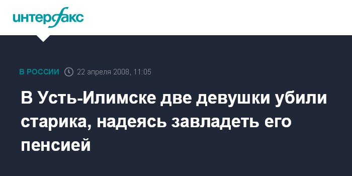 Москва. 22 апреля. INTERFAX.RU - В Иркутской области девушка-подросток вместе с подругой убили приютившего ее старика и украли у него 10 рублей с мобильным телефоном.