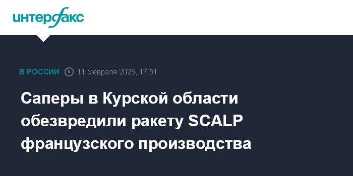Москва. 11 февраля. INTERFAX.RU - Саперы МЧС РФ обнаружили в одном из районов Курской области крылатую ракету SCALP французского производства и обезвредили ее, сообщила пресс-служба министерства во вторник.