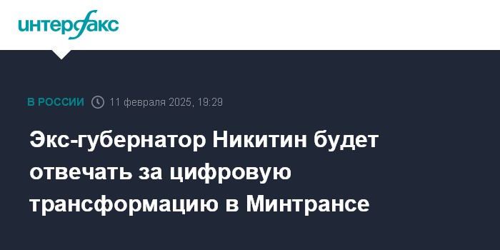 Москва. 11 февраля. INTERFAX.RU - Экс-губернатор Новгородской области Андрей Никитин, назначенный на прошлой неделе заместителем министра транспорта РФ, будет ответственным за цифровую трансформацию в министерстве, сообщили "Интерфаксу" в пресс-службе ведомства.