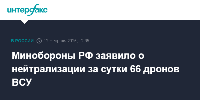 Москва. 12 февраля. INTERFAX.RU - Российские военные за минувшие сутки сбили 66 украинских беспилотников, нанесены удары по аэродромам ВСУ и местам хранения горюче-смазочных материалов, сообщило Минобороны РФ в среду.