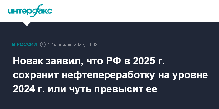 Новак заявил, что РФ в 2025 г. сохранит нефтепереработку на уровне 2024 г. или чуть превысит ее