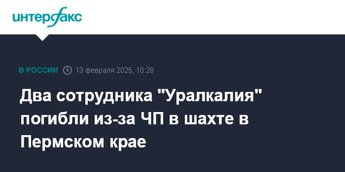 "13 февраля 2025 года в 10:00 местного времени (08:00 по Москве - ИФ) в руднике СКРУ-3 в ходе проведения регламентных работ по осмотру ствола в результате отслоения нароста соли от крепи были смертельно травмированы два работника рудника", - заявили в пресс-службе.