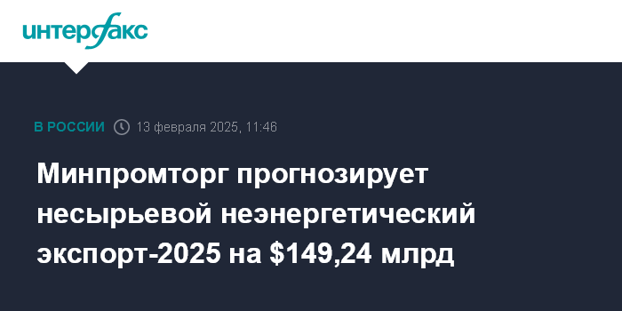 Москва. 13 февраля. INTERFAX.RU - Объем несырьевого неэнергетического экспорта (ННЭ) России в 2025 году ожидается на уровне $149,24 млрд рублей, в 2026 году он может вырасти до $155,25 млрд рублей, говорится в презентации Минпромторга, представленной замглавы ведомства Романом Чекушовым на международном форуме в рамках "Недель российского бизнеса" РСПП.