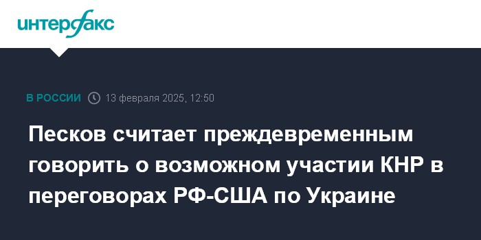 Москва. 13 февраля. INTERFAX.RU - Говорить о подключении Китая к американо-российским переговорам по украинскому урегулированию пока преждевременно, заявил пресс-секретарь президента РФ Дмитрий Песков в четверг.