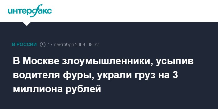 Москва. 17 сентября. INTERFAX.RU - Крупное ограбление совершено в Москве - похищен прицеп с отопительными батареями. Как сообщил "Интерфаксу" в четверг источник в правоохранительных органах города, в среду вечером на востоке столицы двое злоумышленников остановили фуру, заставили водителя машины принять таблетку снотворного, после чего похитили груз на 3 млн рублей. "Около 18:00 в дежурную часть обратился 31-летний житель Краснодарского края, который рассказал, что в 09:00 на внутренней стороне МКАД между Ярославским и Щелковским шоссе его подрезал автомобиль ВАЗ-2107 зеленого цвета, из которого вышли двое неизвестных. Угрожая ножом и пистолетом, пересадили его в свою машину и заставили принять таблетку, после чего он потерял сознание", - сказал собеседник агентства. Он также отметил, что, когда в 19:00 водитель фуры пришел в сознание, он обнаружил, что у его автомашины отсутствует прицеп, в котором находились отопительные батареи. По словам собеседника агентства, общий материальный ущерб составил около 3 млн рублей. По данному факту возбуждено уголовное дело.