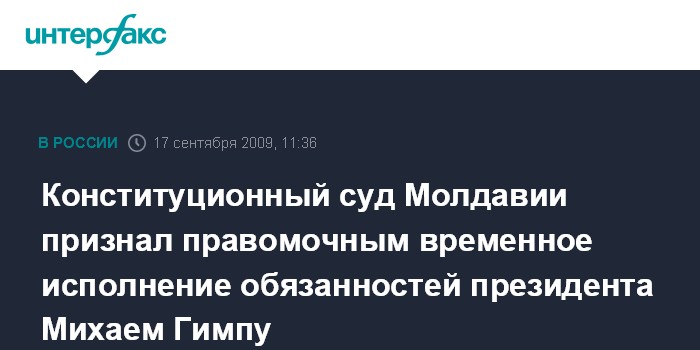 Москва. 17 сентября. INTERFAX.RU - Конституционный суд Молдавии в четверг утвердил полномочия председателя парламента Молдавии Михая Гимпу в качестве временно исполняющего обязанности президента страны.