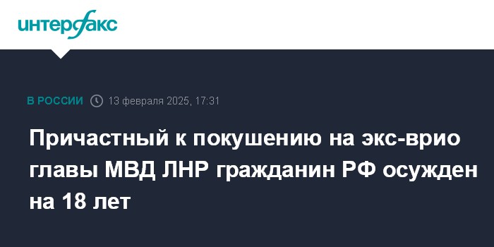 Москва. 13 февраля. INTERFAX.RU - Верховный суд Луганской народной республики приговорил к 18 годам лишения свободы гражданина РФ, обвиняемого в госизмене и причастного к покушению на бывшего врио главы МВД ЛНР Игоря Корнета в мае 2023 года, сообщили в пресс-службе прокуратуры региона.