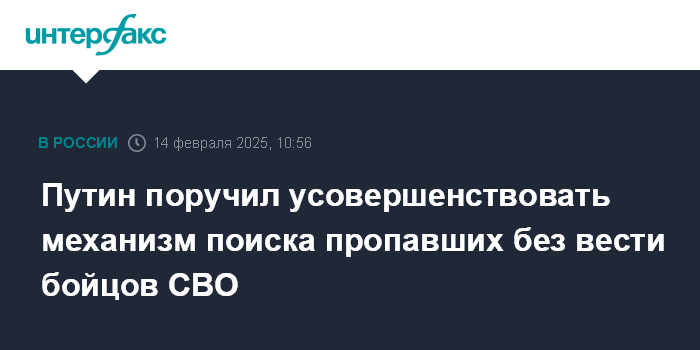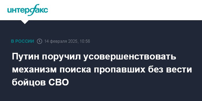 Москва. 14 февраля. INTERFAX.RU - Президент РФ Владимир Путин поручил Минобороны РФ усовершенствовать механизм поиска пропавших без вести участников специальной военной операции, сообщает сайт Кремля.
