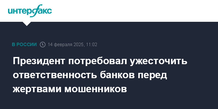 Москва. 14 февраля. INTERFAX.RU - Президент Владимир Путин поручил правительству и Банку России обеспечить внесение поправок в законодательство, направленных на повышение ответственности кредитных организаций перед гражданами, средства которых были мошеннически похищены.