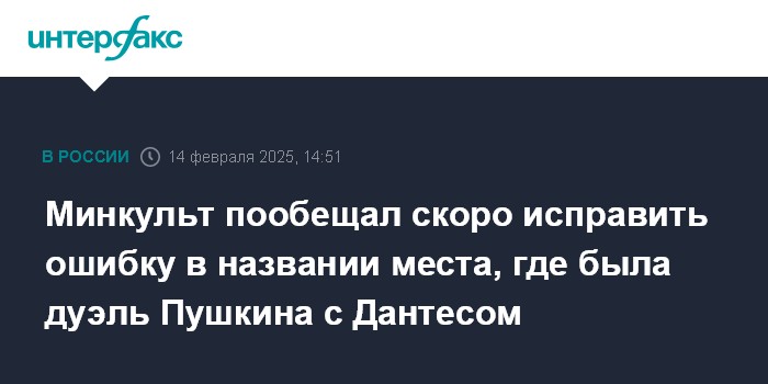 Москва. 14 февраля. INTERFAX.RU - Ошибку в названии объекта культурного наследия – места, где состоялась дуэль между Александром Пушкиным и Жоржем Шарлем Дантесом – исправят в ближайшее время, необходимые документы для внесения изменения поступят в Минкультуры РФ и правительство РФ на следующей неделе, сообщили журналистам в министерстве со ссылкой на первого замминистра культуры Сергея Обрывалина.