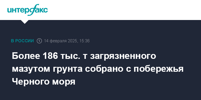 Москва. 14 февраля. INTERFAX.RU - Мониторинговые группы собрали уже свыше 186 тыс. тонн загрязненного нефтепродуктами грунта с побережья Черного моря, где в декабре 2024 года произошло крушение двух танкеров с мазутом.