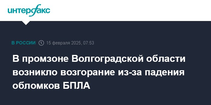 Москва. 15 февраля. INTERFAX.RU - В Волгоградской области в результате падения обломков БПЛА на территории промзоны возникло локальное возгорание, которое было оперативно ликвидировано, сообщил глава региона Андрей Бочаров.