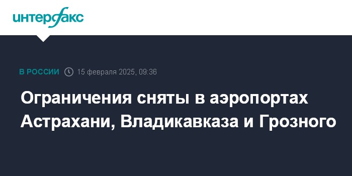 Москва. 15 февраля. INTERFAX.RU - Ограничения на прием и выпуск воздушных судов в аэропортах Астрахани, Владикавказа (находятся под управлением холдинга "Новапорт") и Грозного ("Северный", Чечня) сняты, сообщили в Росавиации.
