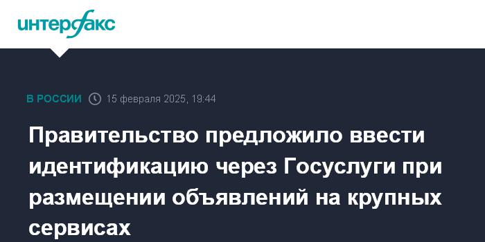 Москва. 15 февраля. INTERFAX.RU - Правительство РФ предложило идентификацию при помощи Госуслуг, а также биометрии всех лиц, размещающих информацию на крупных сервисах объявлений. Соответствующий проект закона (842276-8) опубликован в субботу в базе законодательной деятельности палаты парламента.