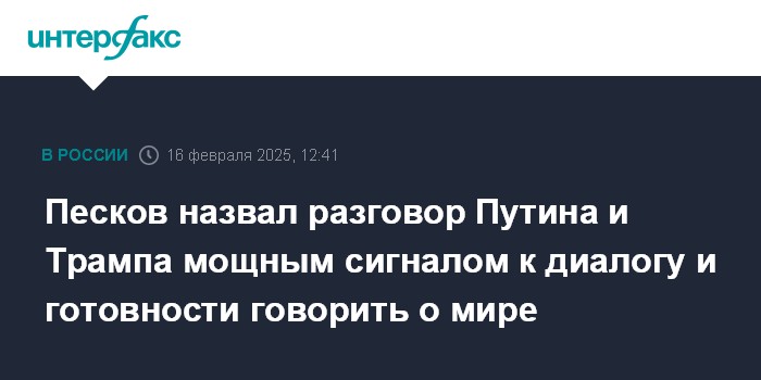 Москва. 16 февраля. INTERFAX.RU - Состоявшийся телефонный разговор между президентами России и США Владимиром Путиным и Дональдом Трампом является мощным сигналом того, что две страны попытаются решить существующие проблемы посредством диалога, заявил пресс-секретарь президента РФ Дмитрий Песков.