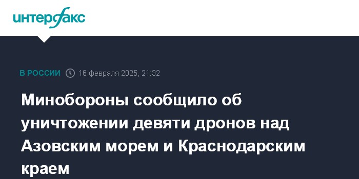 Москва. 16 февраля. INTERFAX.RU - Девять украинских беспилотников сбиты российскими военными в воскресенье вечером над Азовским морем и Краснодарским краем, сообщило Минобороны РФ.