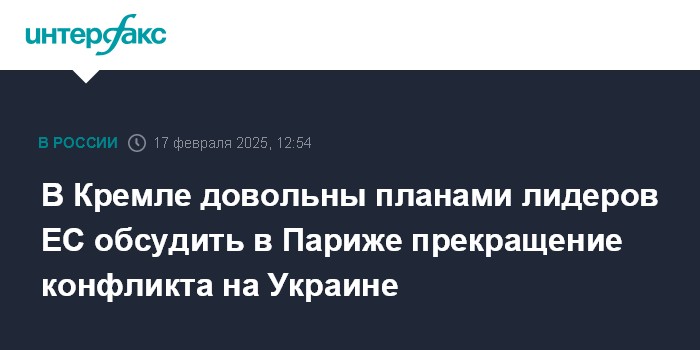 Москва. 17 февраля. INTERFAX.RU - В Кремле назвали положительным фактом то, что европейские лидеры обсудят 17 февраля в Париже планы мирных переговоров по Украине. Об этом сказал на брифинге пресс-секретарь президента России Дмитрий Песков и предложил дождаться результатов этого саммита.