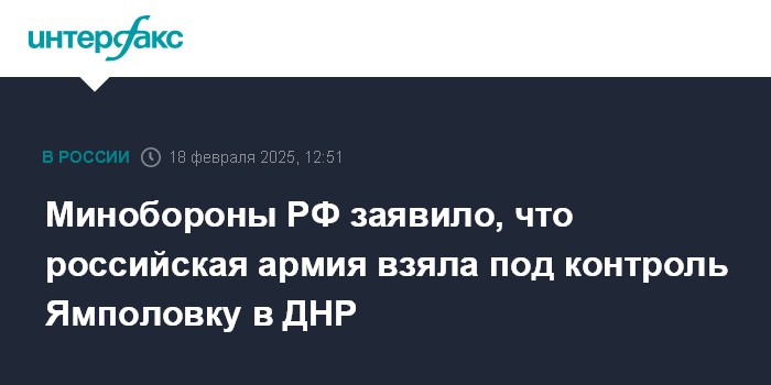 Минобороны РФ заявило, что российская армия взяла под контроль Ямполовку в ДНР