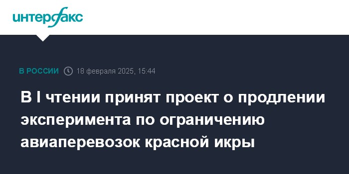 Москва. 18 февраля. INTERFAX.RU - Госдума приняла в первом чтении законопроект, который продлевает до 1 августа 2027 года срок действия эксперимента по ограничению перевозок красной икры непромышленного изготовления на Камчатке, также документ включает в эксперимент Чукотку и Хабаровский край.